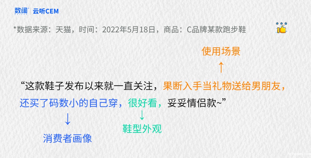 如某款跑步鞋“用来做综合训练很不错”,即可以作为综训鞋使用;如某款户外鞋“网布材质不闷脚,防撞鞋头在打羽毛球时减少了脚趾碰撞受伤”,即叠加了羽毛球运动的使用场景……消费者作为长期使用者,是产品的场景使用的最直观感受者。