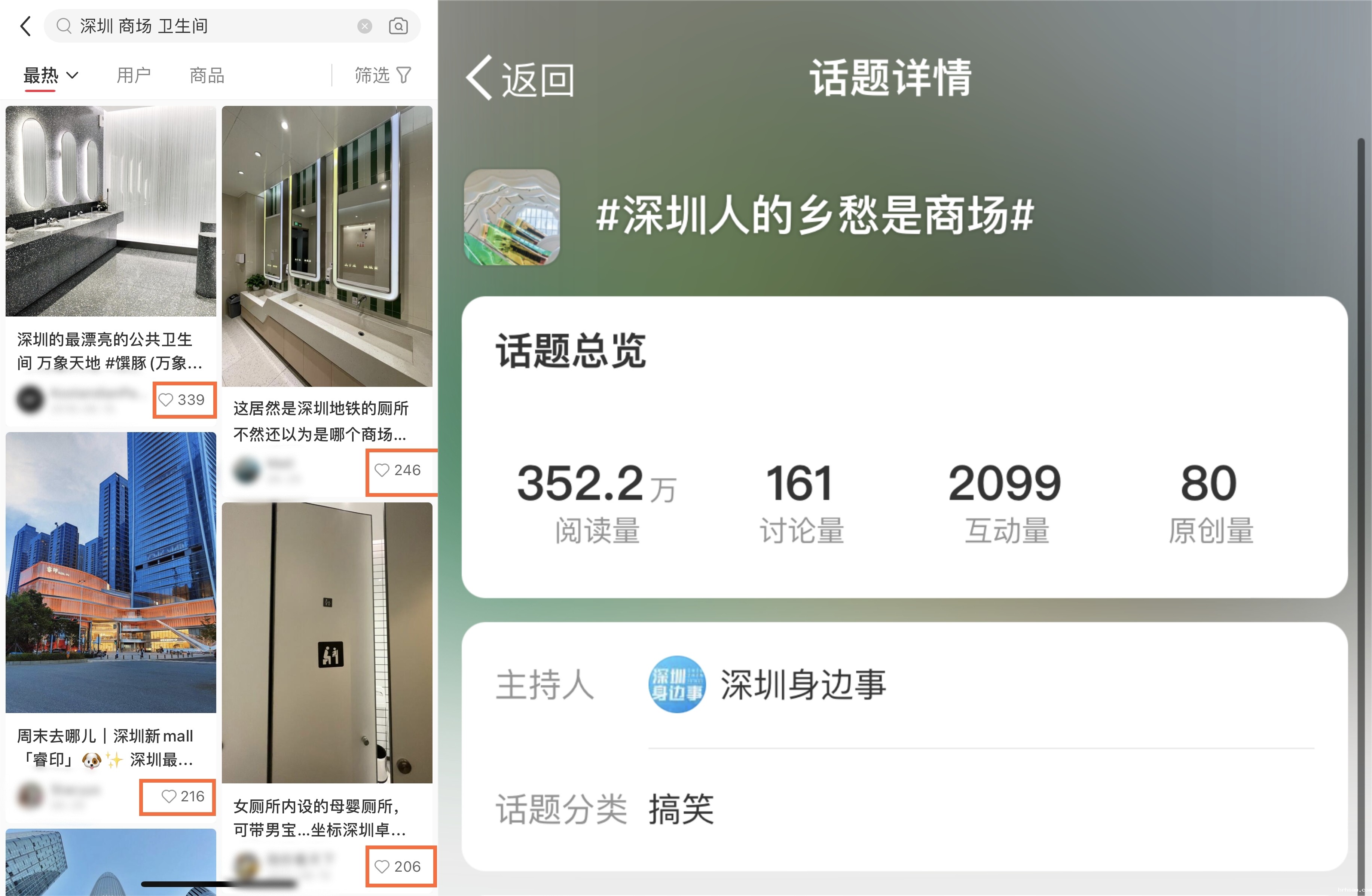 打开小红书,搜索“深圳、商场、卫生间”这几个关键词,相关分享贴数量和热度可能会超乎你的意料。