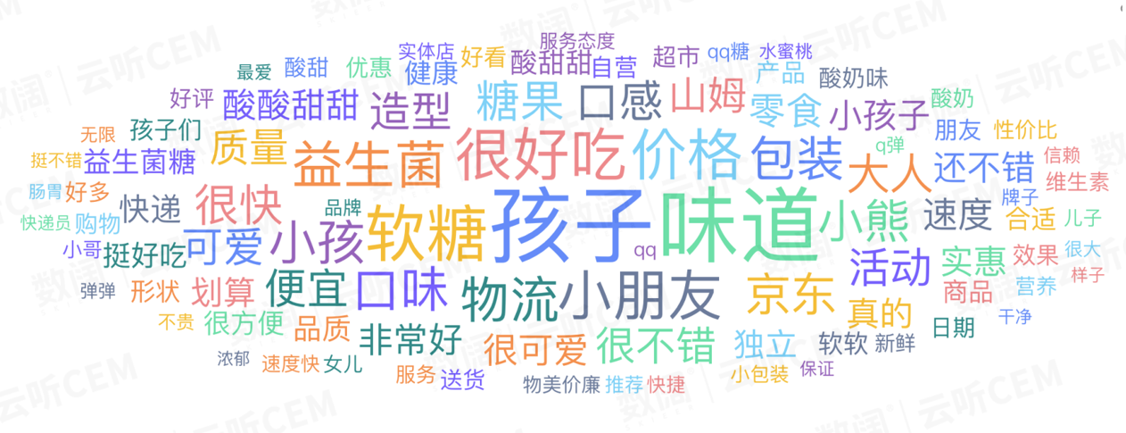 通过消费者评价热词Top100能看到,消费者除整体表示“很不错”外,对“实惠、性价比”有较高赞赏,并对产品味道、功能性关注度也较高;而消费群体则主要以父母为孩子购买为主。