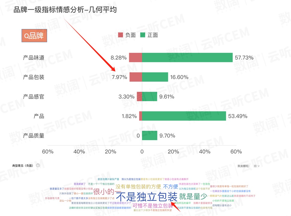 Q品牌在分析反馈焦点中发现,消费者对新品整体的满意度高于行业平均线,但在包装和净含量上,消费者提到了较多的负面反馈声量。