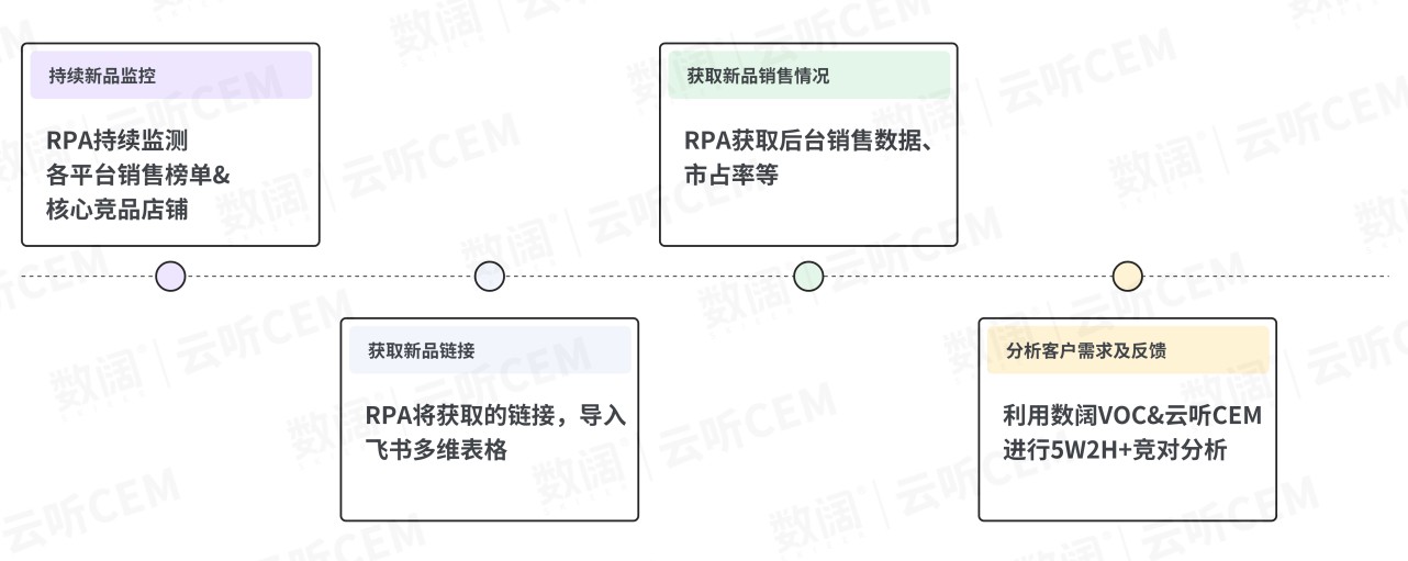 在新品研发阶段,taptap亚洲云听CEM+八爪鱼RPA能在电商平台搜集对标竞品品牌的产品信息,并同步到飞书表格,通过飞书表格做定期提醒,让产