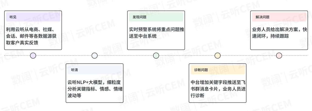 即先广泛接入邮件、电商平台、社媒平台、客服平台等多源数据,再利用自研NLP细粒度模型+大模型,分析消费者反馈中的关键指标、情感、情绪波动等核心信息,并实时预警、将重点问题推送至中台系统,利用飞书群消息卡片推动业务人员进行诊断和闭环处理。