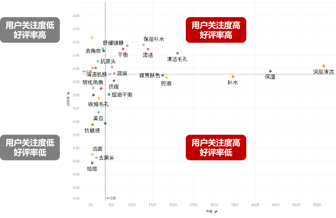 我们将销量Top20洗面奶产品电商评论采集下来,并将各项指标表现标记在坐标轴上(横轴为声量,纵轴为好评率),如下图: