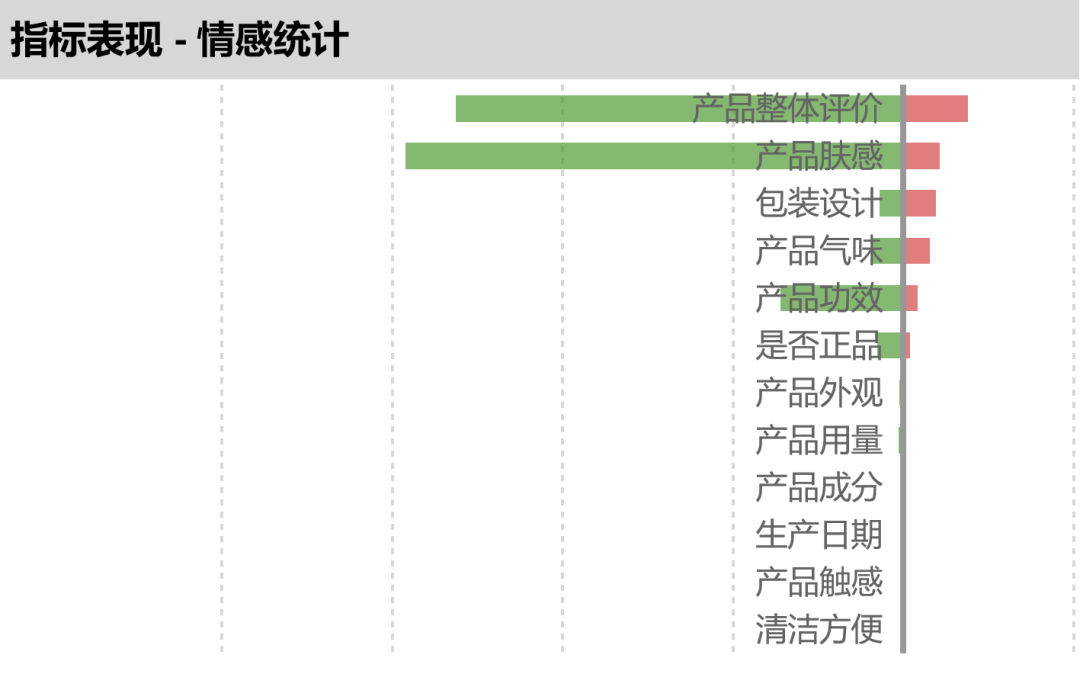 用同样的技术,我们对采集回来的每一条电商评论进行分析处理并汇总统计,通过可视化图表展示每项指标在消费者心中的表现。