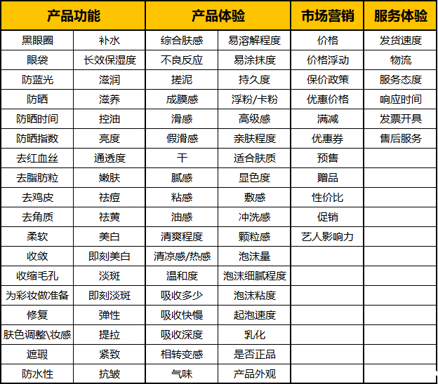 如图,我们可以将产品分析维度分为产品核心、产品其他、市场、服务4个一级指标,再往下钻取,还能提取颗粒度更细的二级指标,如肤感、功效、触感、成分、包装设计、价格、赠品、物流、客服等等。