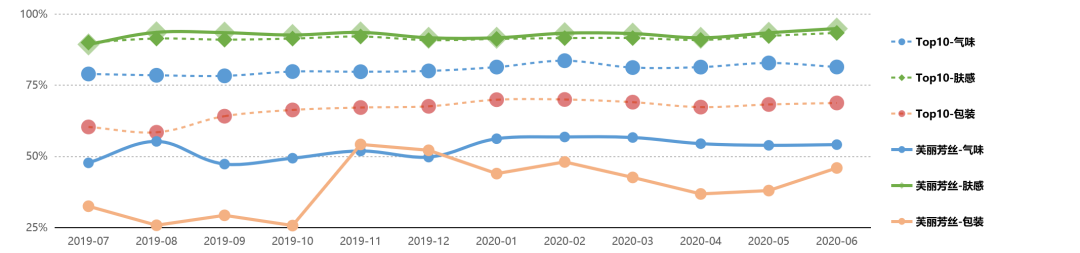 尤其在「气味」指标上,Freeplus的表现低于Top10均值超过20%。而「包装」指标虽然在2019年11月有了25%提高,但起起伏伏,目前与Top20均值水线仍有7.5%差距。