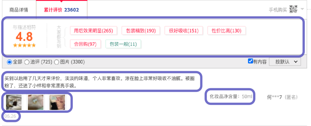 我们在竞品目标中找到Top销量的爆款产品,并采集了他们的电商评论,从用户反馈中挖掘爆款到底有哪些优点?用户都在夸赞它什么?
