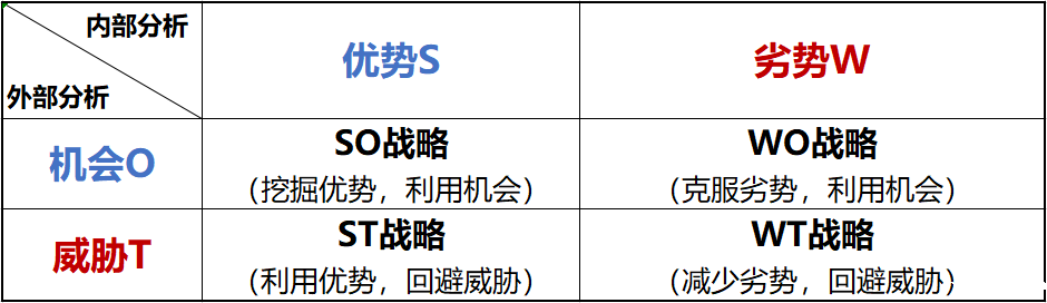 SWOT(Strengths,Weaknesses,Opportunities,Threats)分析法框架,通过“优势、劣势、机会、威胁”四个维度对产品功能点进行梳理对比。