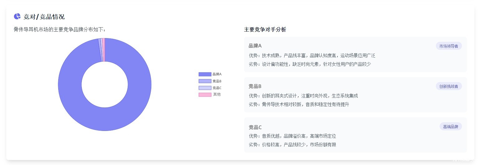 报告不仅清晰呈现了外观设计、佩戴稳固性、运动场景续航等核心标签维度的声量分布与情感倾向,还通过本竞品 VOC分析,直观对比本品与头部产品的体验差距,同时结合目标市场的需求趋势洞察,明确了用户未被满足的潜在诉求。基于报告建议,品牌快速落地了「优化耳挂装饰属性」「提升中高频音质表现」等关键改进动作,最终使得该款骨传导耳机在3个月内从品类销量TOP 5跃升至TOP 3,实现了体验与业绩的双重突破。