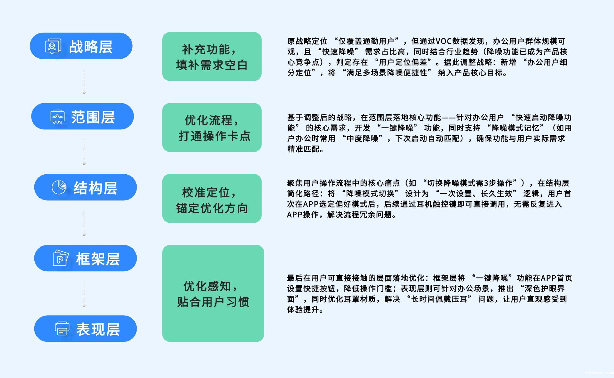 产品体验分析的最终目的是提升用户体验,因此在明确体验痛点与挖掘深层根因后,需遵循 “战略层→范围层→结构层→框架层→表现层” 的产品设计顺序,输出针对性优化方案,确保每个优化动作既能解决根源问题,又能覆盖用户直观感知,形成 “分析—优化—验证” 的完整闭环。
