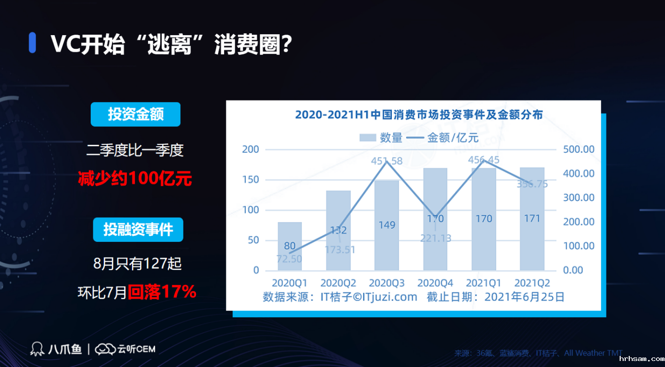 第三,品类竞争饱和。以我们目前服务和研究的化妆品类来说,每天上新的品牌可能有几百家。所以,现在整个投资界对新消费赛道已经逐步放缓,从2021年第一季度和第二季度的投资数量和投资标的的数额来看,都在下降中。