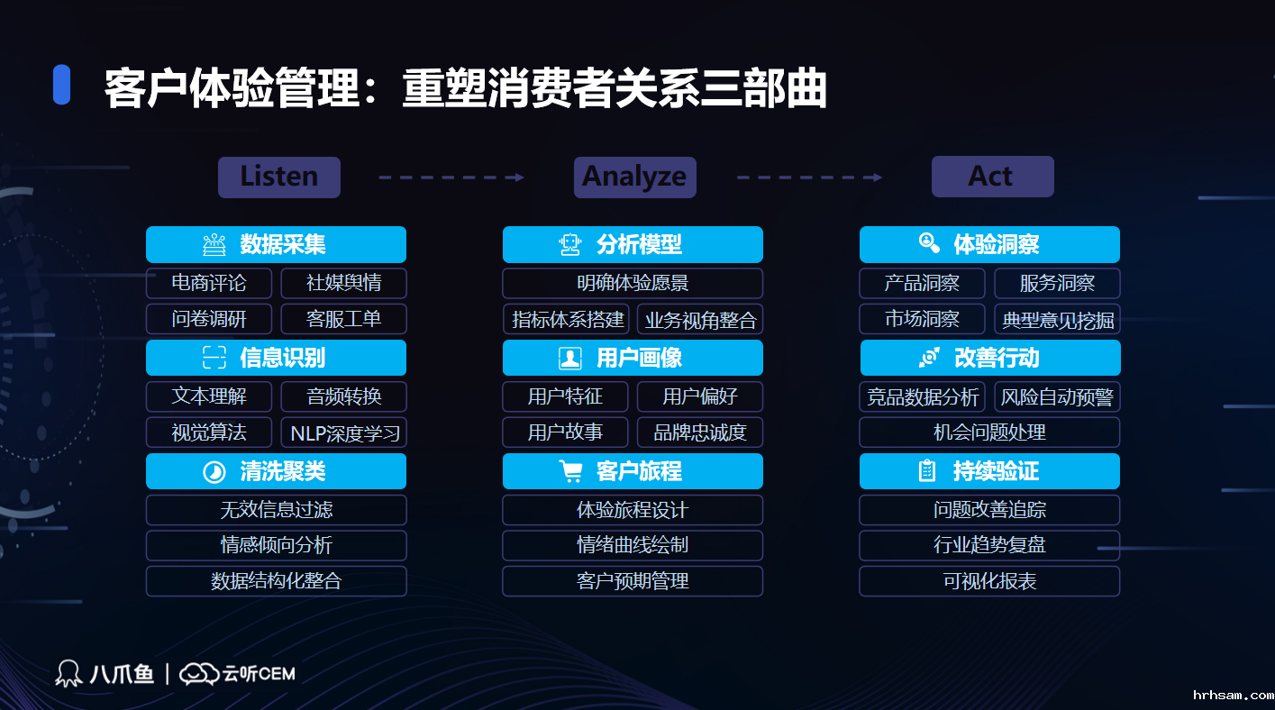 这里我们提出一个客户体验管理的三部曲:第一步叫数据采集,目前我们能做到全渠道各类数据的采集,同时进行信息识别、清洗聚类;第二步开始构建分析模型、绘制用户画像,并基于不同部门的业务视角搭建客户体验的旅程设计;第三步就是体验洞察,推动行动改善,同时持续验证。