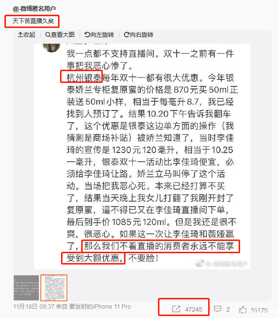 在欧莱雅事件热度最盛时,新浪微博上#天下苦直播久矣#的讨论居高不下。有消费者反映,受电商主播最低价的限制,杭州银泰商场某品牌的线下优惠活动被迫取消,而消费者原本能通过线下渠道购买到更低价的商品的优质体验因此告吹。当其他渠道都为一种渠道让路时,其走向将是不可控的。