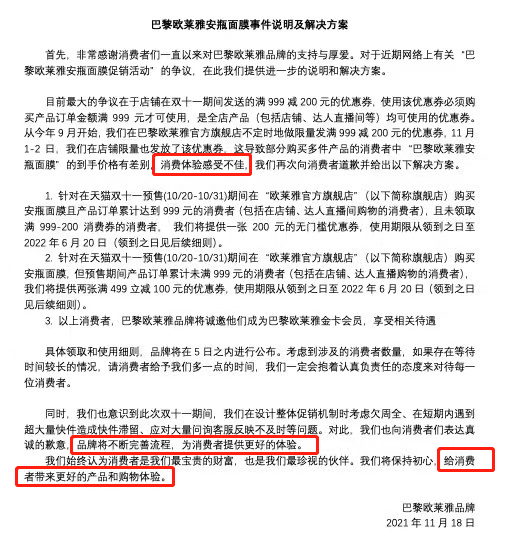 在欧莱雅官微发布的该事件解决方案中,“消费体验”一词被反复提及。在本起事件中,“消费体验”直指价格,听信品牌方关于直播间最低价宣传的消费者感觉蒙受欺骗,但与此同时,另一种声音也在社媒平台涌现:不看直播、通过官方店铺等渠道下单的消费者难道就没有享受低价的权益吗?这是一场藏在品牌、直播、平台背后的消费体验激战。