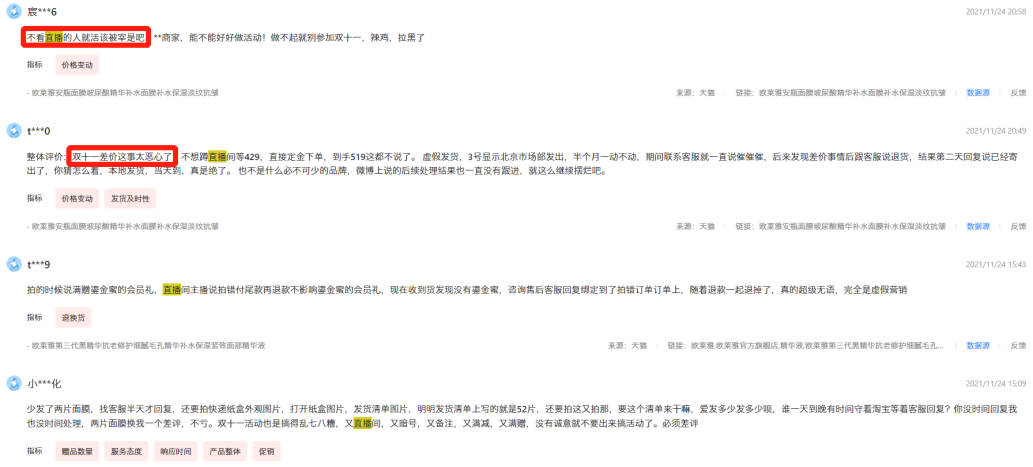 (与“直播”相关的评论;图源:欧莱雅天猫官方旗舰店)