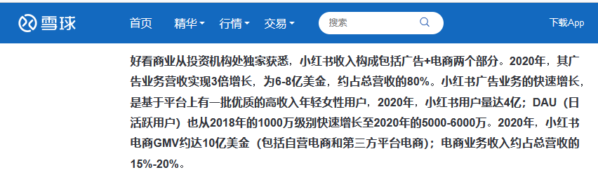 2020年,小红书广告营收6-8亿美金,约占总营收80%。广告业务是小红书最主要的营收来源。