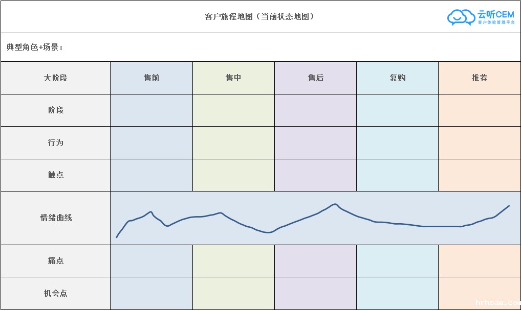 一般而言,一个基础的当前状态地图包含售前、售中、售后、复购及推荐等几个阶段,同时包含行为、触点、情感曲线、痛点、机会点等几个指标。