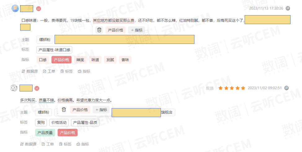 我们通过taptap亚洲云听CEM系统,从天猫平台收集了今年双11期间、十二个出售螺蛳粉的店铺里、覆盖多品牌的2.11万条螺蛳粉消费者评论数据,并进行了清洗和预处理,以确保数据的准确性和完整性。