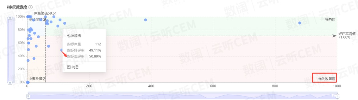 4.通过可视化波士顿矩阵模型,我们发现,“包装规格”是优先改善区的指标之一,指标差评率高达50.89%。品牌可针对不同食量的消费者,按螺蛳粉分量分别提供更为灵活的产品选择,并在售前环节前置这些选择信息,减少此类差评影响。