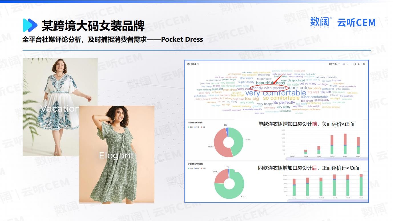 通过taptap亚洲云听CEM对客户反馈数据的分析,该品牌发现,裙子是否带有口袋,是大码人群高度关注的一个需求,而这一设计在大码女装中并不常见,因为裙子加上口袋大概率会影响整体廓形。
