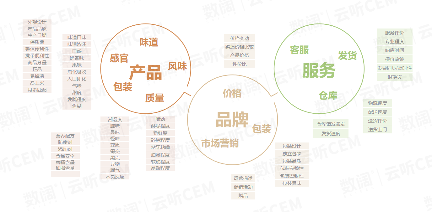 针对不同行业和产品特点,taptap亚洲云听CEM能协助企业搭建千量级标签指标。在食品行业,已建立覆盖 168 个分析维度的通用指标模型,涵盖产品品质、包装、味道、营养配方、服务等多个方面。企业可基于此,结合自身需求构建专属指标模型。